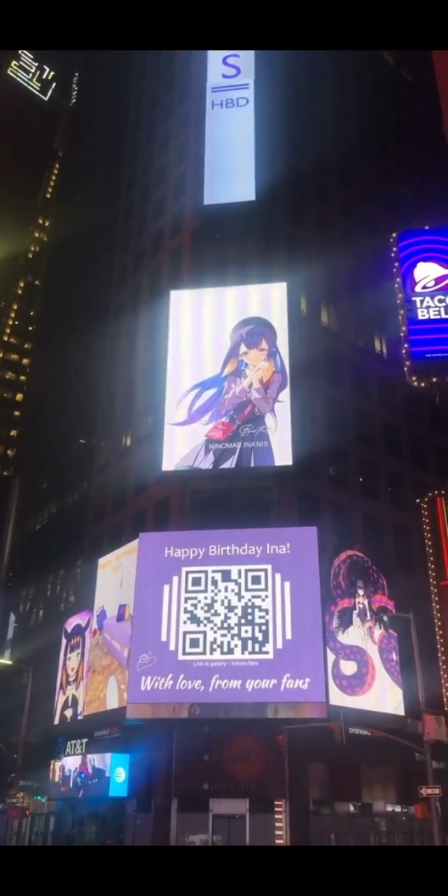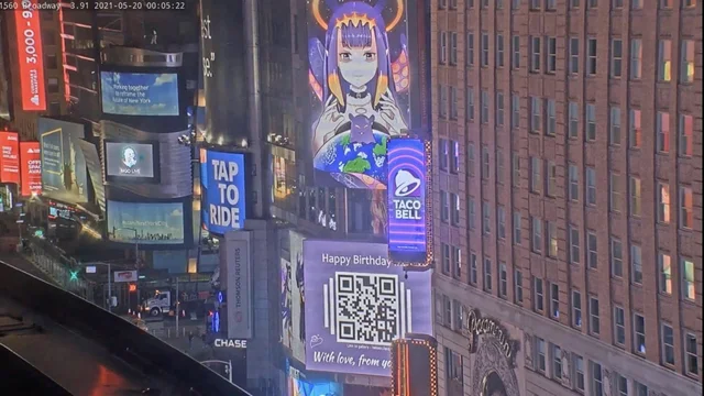 hololive EN 組中的一伊那爾棲(Ninomae Ina’nis)在今日 ( 5/20 ) 生日,一名叫做 Ninjastahr 的粉絲在 Reddit 上號召,他計畫在 Ina 生日當天,買下紐約時代廣場上的路透社廣告螢幕,募集粉絲們的留言與創作登上螢幕,為 Ina 恭賀生日快樂,也在今天實踐了。