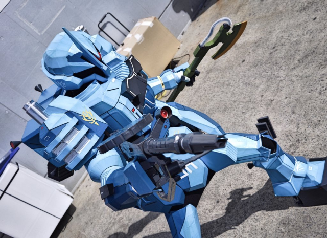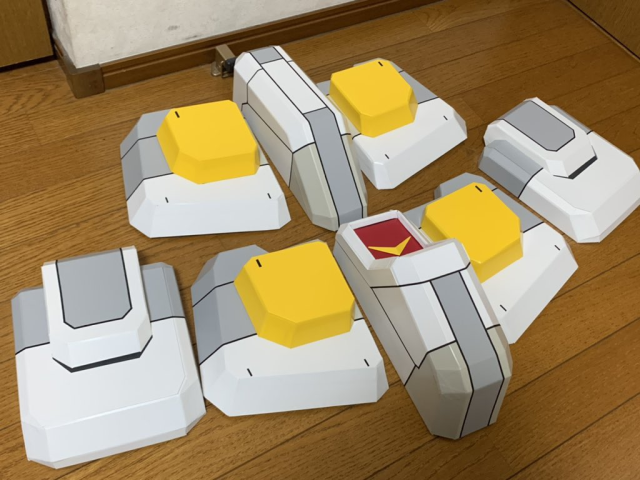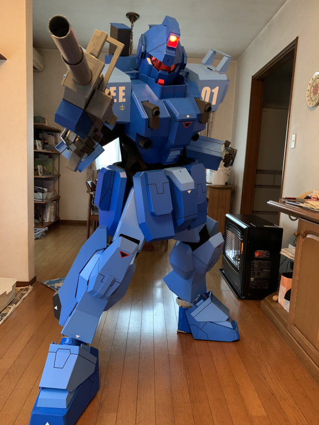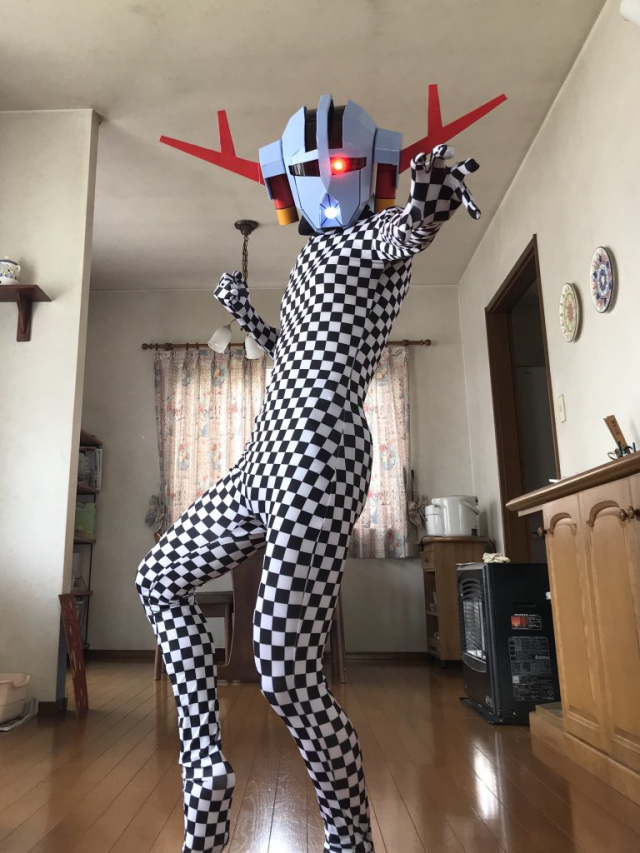 他使用了製作模型的風釦板 ( スチレンボード ) 來製作,切割組裝後開始塗色,原先製作是為了參加 8 月舉辦的「スーパーロボコス大展」,可惜因為肺炎疫情的關係,目前無限延期中,尚未得知是否能順利舉辦。他之所以會選擇初鋼製作,也是因為認為初鋼在機器人相關作品的代表性與辨識度較高,穿上之後也有截然不同的感受。