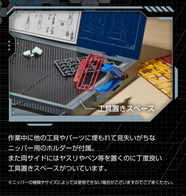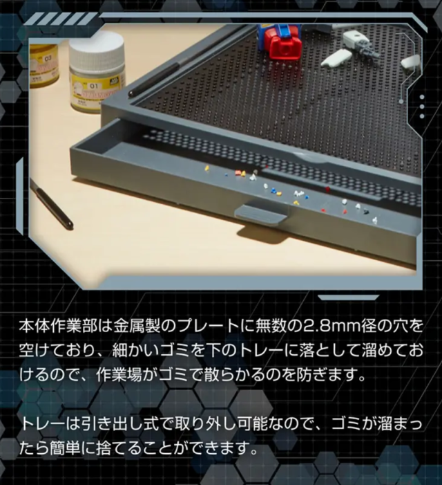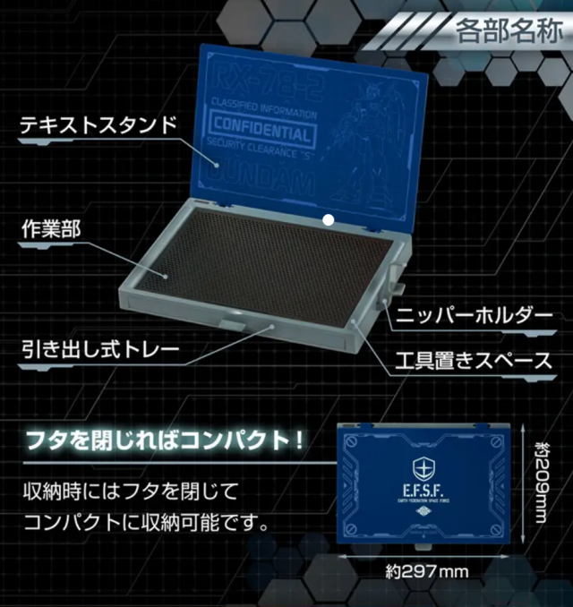 三款分別以;地球聯邦軍吉翁軍夏亞專用的色系打造,方便各位模興愛好者用來組裝鋼普拉,大小為長297x寬209x高30mm,適合組裝各類的模型組件放置。網狀的作業台適合打磨切割的碎屑收集,下方還配置有小抽屜可以使用,收納各種組裝模型的器材,各位鋼普拉新手老手都可以使用。