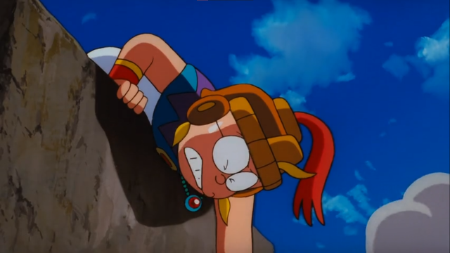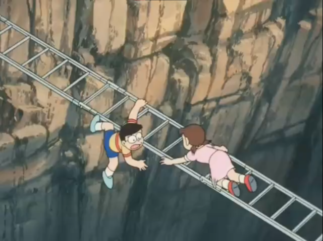 ▼在《哆啦A夢:大雄的發條都市冒險記》,大雄為了救裙子被梯子勾住的靜香,結果失足掉落山谷