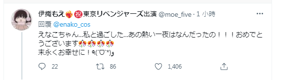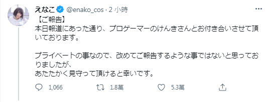 根據日本文春媒體報導,日本業界收入最高的COSPLAER:えなこ(Enako)被發現與職業選手けんき同居兩年多,現在還處在同居狀態,而本人在推特並沒有否認,僅表示:「就如今天報導所言,我和けんき交往屬實,但這是私事,所以我不會特地公開說明,如果你們能祝福我們,我將感激不盡!」另外,知名COSER伊織萌也特別來詼諧留言,讓氣氛變好許多。