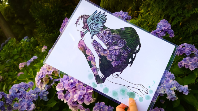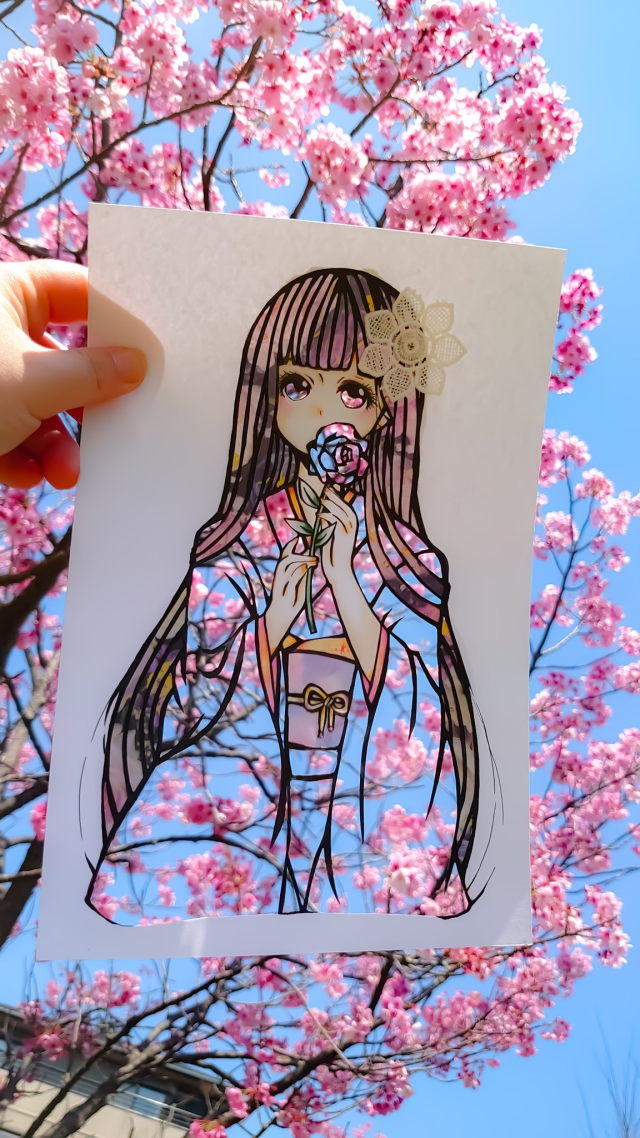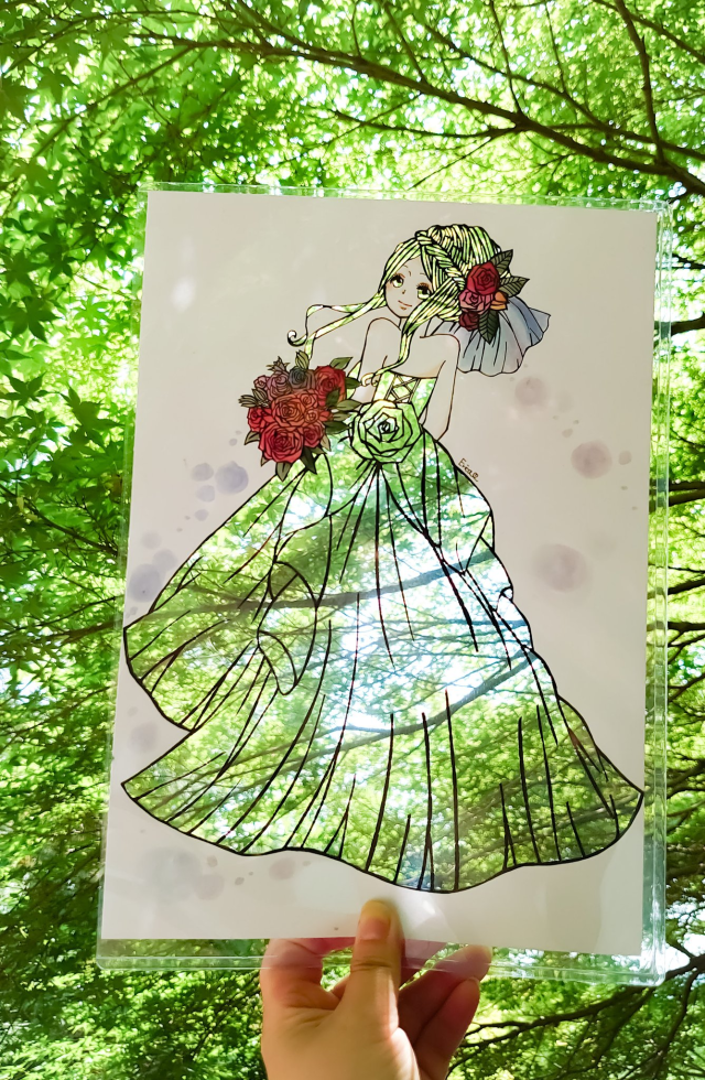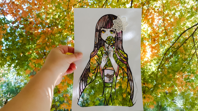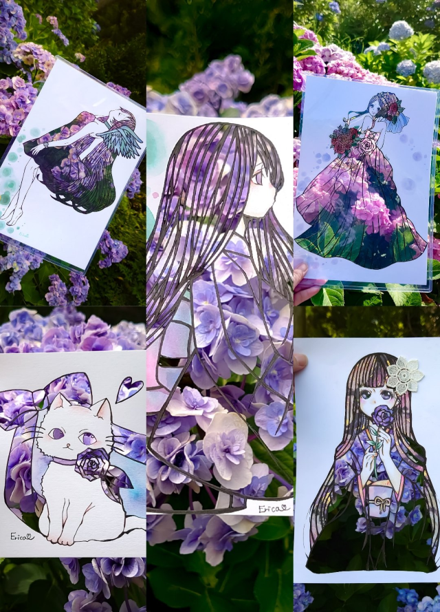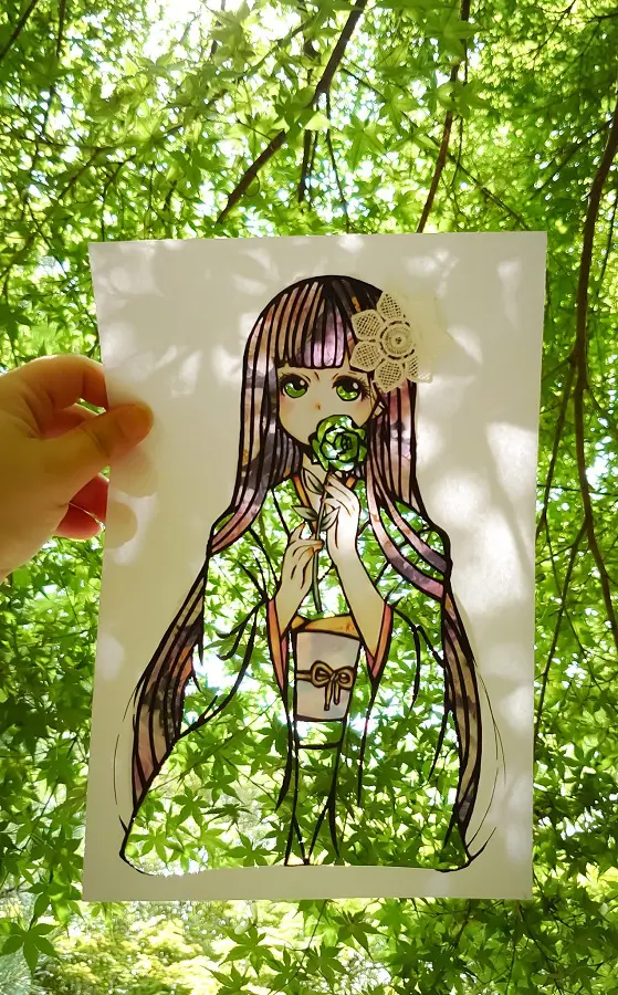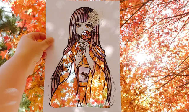 Erica 從事剪紙創作已有一段時間,這次在推特上分享的是一個穿著和服的美麗少女,結合剪紙將少女的和服線條呈現出簍空的樣貌,用於配合背後的背景呈現不同風貌。