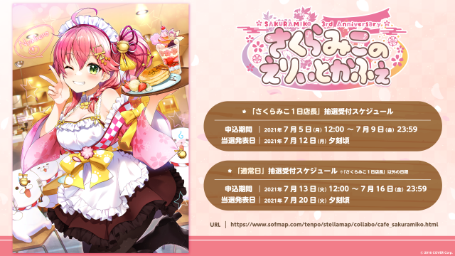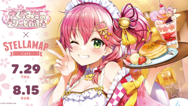 COVER公司下「hololive」所屬藝人「櫻巫女」即將邁向三周年慶祝,特別與STELLAMAP Cafe推出合作–櫻巫女菁英咖啡廳 ,從套餐到甜點一應具全,還有粉絲絕對不會想錯過的限定商品,時間從7月29日到8月15日,並在在sofmap AKIBA4號店7F STELLAMAP Cafe期間限定開幕。