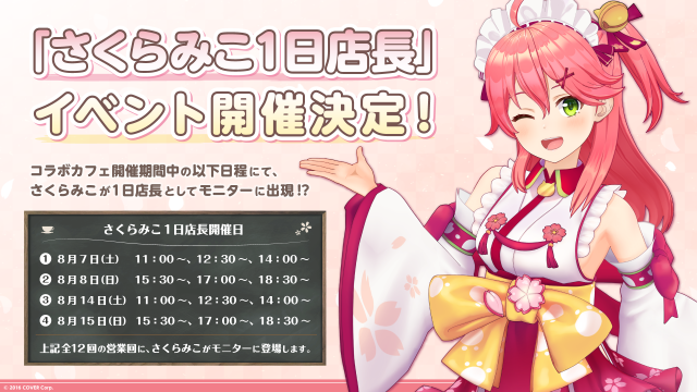 另外,櫻巫女的「一日店長」時間將在咖啡廳的螢幕出現,配合的時間為以下四天,總共12次的見面機會。