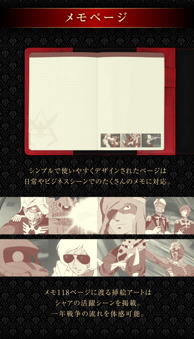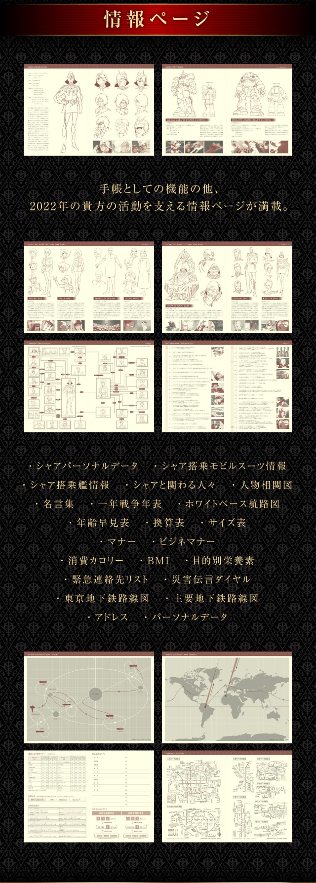 另外,手帳內部也絲毫不馬虎,而內頁有各種夏亞在劇中的場景插圖等,附錄頁更有多種情報資料,包含夏亞個人的資料和插圖、名言蒐集,以及其搭乘過的專用機體、一年戰爭的年表等。 另外也有熱量換算表、BMI 、東京地鐵路線圖等實用的生活資訊。讓夏亞的精神融入你的生活,使用這本手帳再適合也不過啦 !