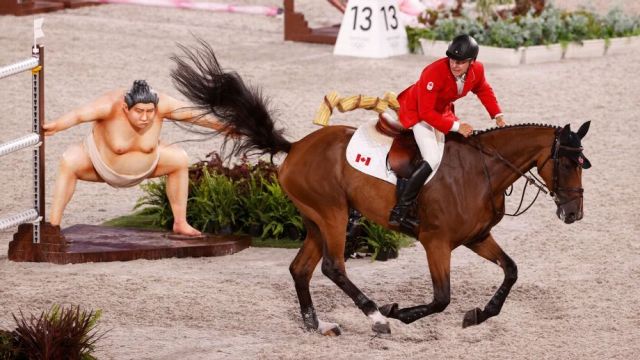 可以看到在馬術賽事會場看,各項障礙物皆是以日本文化特色做為設計主題,包含了不倒翁、相撲、藝妓…等立體藝術雕像,其他甚至還有歷屆奧運的代表跨欄。或許人類來看是覺得充滿特色、充滿藝文風格的設計,但對馬兒來說,由於本身視覺感知較差,因此像這種相撲、不倒翁…等物體,就很容易因此受到驚嚇。