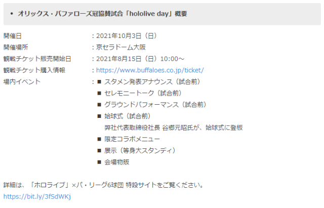 近年日本職棒與動漫作品合作已經越來越常見,包含;《假面騎士》、《新世紀福音戰士》與《咒術迴戰》等都在一兩年內出現過。近日日本職棒太平洋聯盟宣布,將與日本 Cover 社旗下 Vtuber 經紀品牌《hololive》合作,將會有合作企劃的球衣與周邊商品期間限定販售,並於今年 10 月 3 日歐力士猛牛在大阪京瓷巨蛋舉辦聯名的「hololive day」。