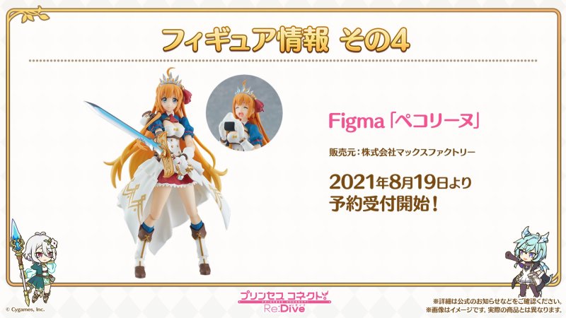 此次隨著《超異域公主連結☆Re:Dive》動畫版第二季宣佈製作,也決定將在 figma 系列推出主角「貪吃佩可」首款可動人偶。在目前公開的官圖樣品可以看見,figma 貪吃佩可透過細膩造型再現遊戲中設定,有著透明材質製作的頭冠,使用金屬色塗裝的飾品,靈活可動能再現雙手持「公主之劍」姿勢,配件更能替換幸福洋溢的吃東西臉搭配巨大飯糰!更詳細的商品情報將於日後公開。