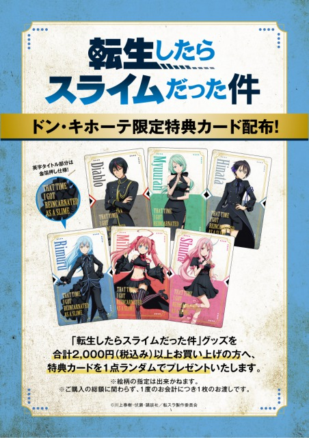 自8月28日開始,《關於我轉生變成史萊姆這檔事》將與連鎖商店「唐吉軻德」合作,推出限定商場商品之外,還有額滿2000日圓贈送的鋁箔收藏卡。