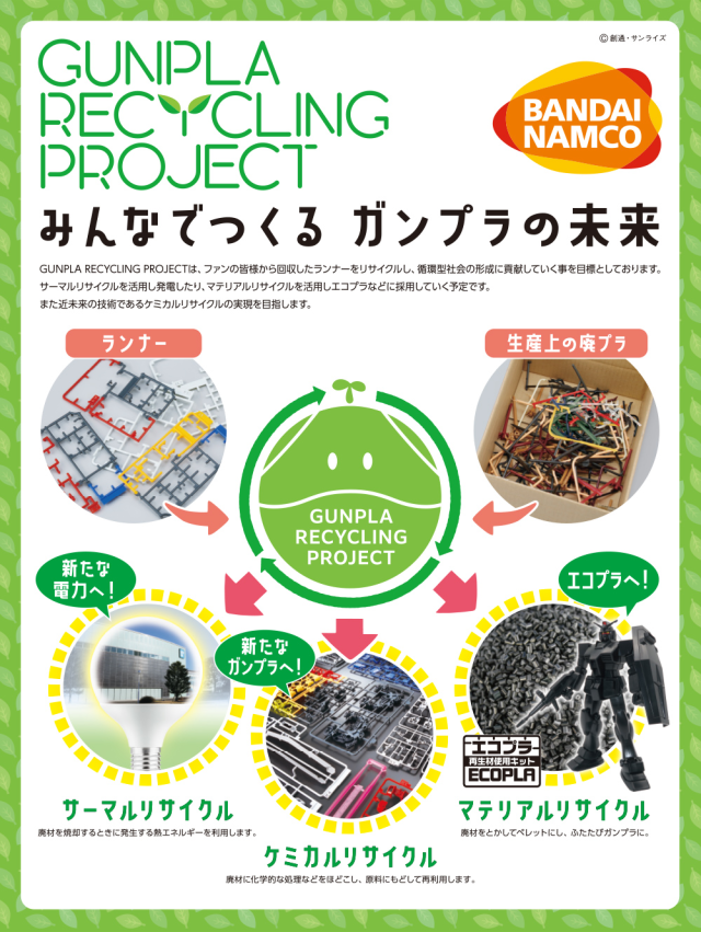 萬代南夢宮推出的「鋼普拉回收計畫」(GUNPLA RECYCLING PROJECT)已經在2021年4月1日正式啟動,該計畫旨在透過回收製作鋼普拉留下的廢零件框架來進行化學技術再生成另一種全新的組裝模型商品。(延伸閱讀)