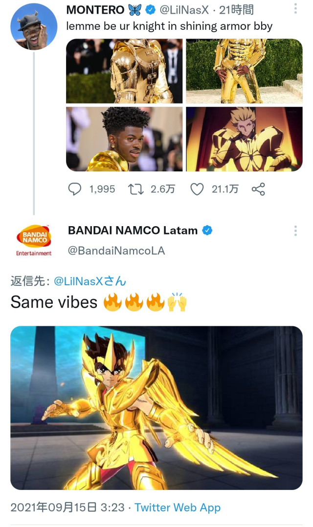不論是《Fate/Grand Order》的吉爾伽美什還是《聖鬥士星矢》的黃金聖衣, Lil Nas X 這次的服裝成功成為的話題,不論在歐美還是日本都成為一個有趣的話題人物。或許各位讀者不熟悉這位饒舌歌手,不過或許你會記得他是一位穿上聖衣跟英雄王服裝的歌手才是 www。