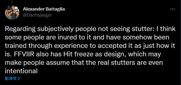 至於,《Final Fantasy VII 重製版 Intergrade》PC版真的有像Alex Battaglia所評測的那麼慘烈嗎?在該媒體人於Twitter上發布這則結果不久,留言反應卻也呈現了兩極化,有部分網友反應,自己從Epic Games Store購買遊玩到現在,也並沒有發現到高頻率卡頓、掉幀,不過Alex Battaglia卻也反駁表示很可能部分玩家早就習慣這樣的遊戲品質。