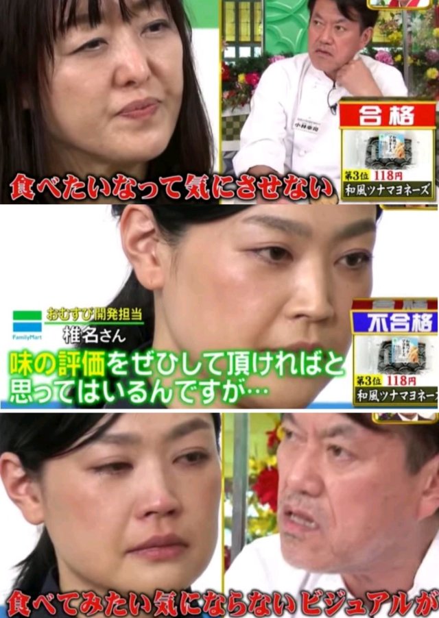 最終毫不意外小林幸司給出了不合格的評分,小林幸司解釋「外觀是非常重要的,無法讓人提起食慾的外觀,我是絕對無法接受的。」而商品開發人員則是被小林幸司嚴厲的批評眼眶泛淚。