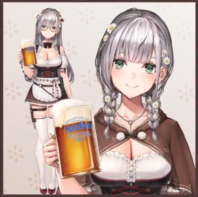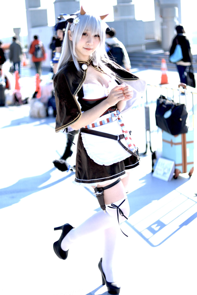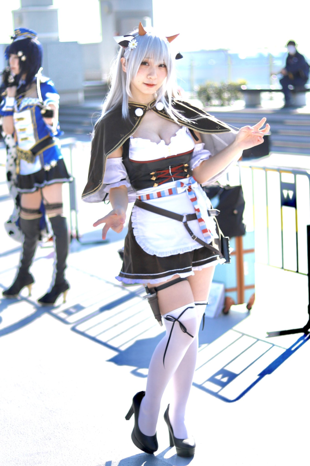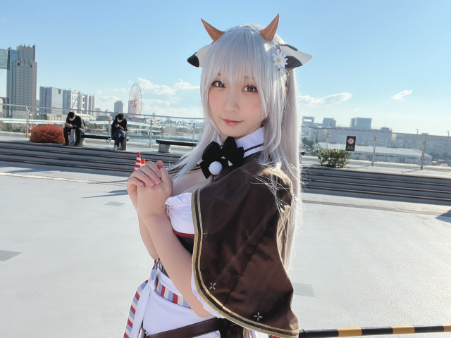 本次選擇的是白銀諾艾爾在今年 10 月亮相的歐式服務生服裝,除了服裝本體外,連頭上的牛角與耳朵都有還原。不過大家都知道團長的身材…太傲人人了,就算是身材同樣很好的伊織萌好像還是…不夠大 ( ? )