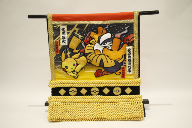 而在一樓入口處也會展示活動限定造型的相撲纏腰布,圖案為皮卡丘與鐵掌力士,並且兩者旁邊也寫著代表招式「電光石火」與「全力無雙激烈掌」。