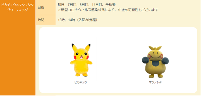 ▼第一、七、八、十四日和千秋樂的下午1點與2點有皮卡丘和幕下力士的見面會