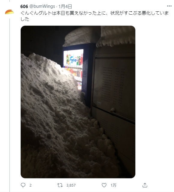 這誇張的雪量令人絕望,而接下來的幾天,雪量更是有增無減……該不會真的要等到春天,才能喝到飲料吧……。