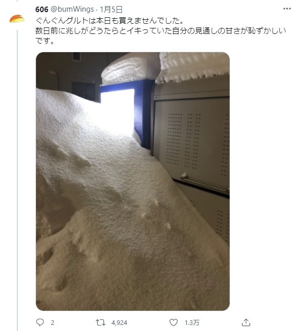 推主最早的發文在去年12月19日,大雪紛飛的日子中,他貼文說「買不到乳酸飲料了啊。」