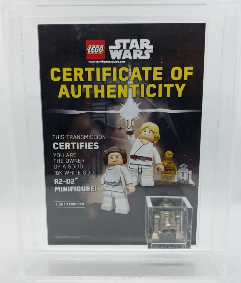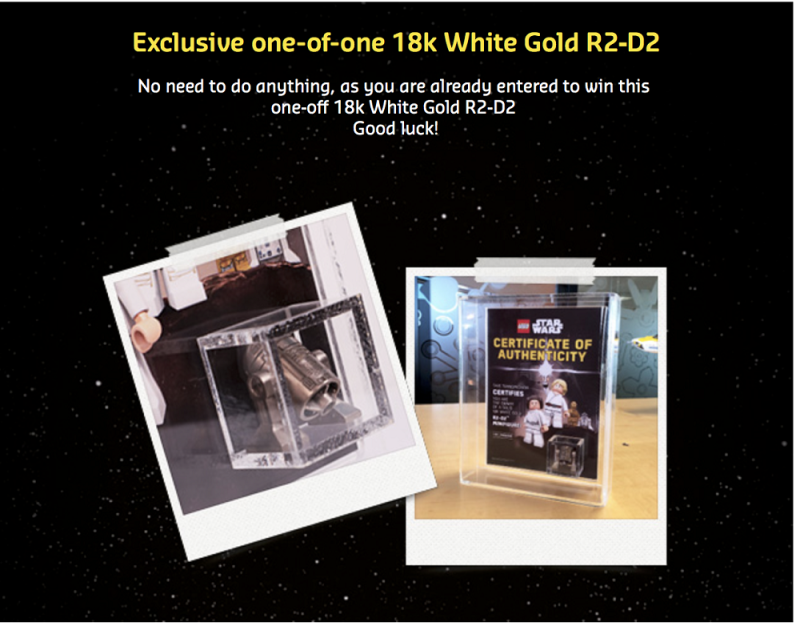 在 2017 年年末,樂高發佈了一項名為「R2-D2 Contest」的免費抽獎活動,只要註冊即可參加,獎品是樂高以鉑(Platinum)製成、價值來到 3,300 元美金的 R2-D2 人偶!在當時的活動宣傳影片中,一共有 16 個由貴金屬製作的 R2-D2 樂高,其中包含了 10 個銀製、5 個鉑製,以及僅僅只有 1 個的白色合金(White Gold)材質 R2-D2。