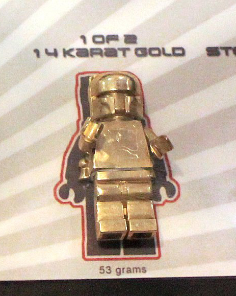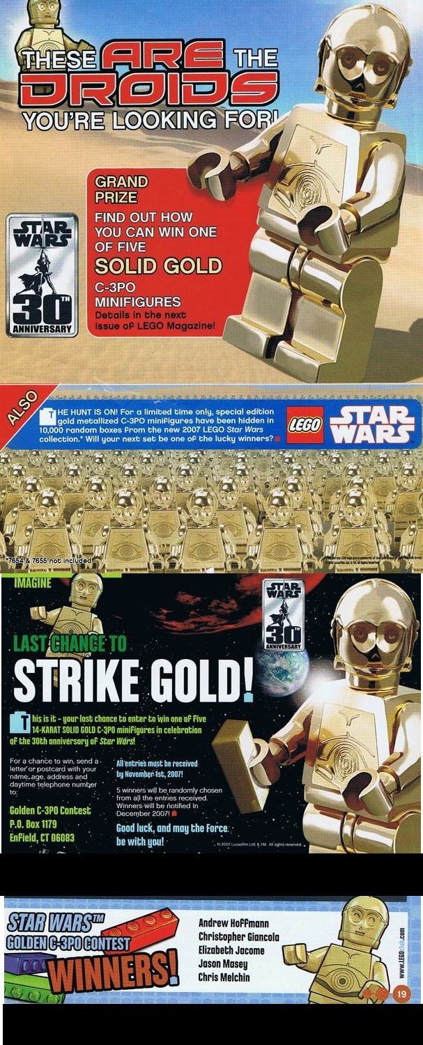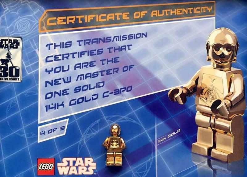 樂高在 2007 年時為了慶祝星際大戰的 30 週年,曾經以 14K 金打造了全球僅有 5 隻的 C-3PO,這 5 隻可說是星戰迷的夢幻人偶是作為 LEGO Magazine 抽獎活動的贈品;值得一提的是,與幾乎同時間「會隨機在星戰盒組內驚喜登場的鍍金 C-3PO人偶」(全球共 10,000 隻)相比,這款 14K 金的 C-3PO 樂高人偶幾乎沒有在拍賣網站上現身過。