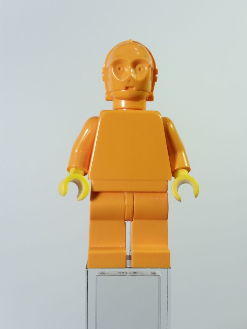 於 1999 年生產出來的 C-3PO 樂高人偶橘色原型,同樣也是數量不明、在拍賣網站上極少出現的人偶;值得一提的是,1999 年正是樂高星際大戰商品開始發售的一年,而這個原型,想必是為了 2001 年的盒組「7106 機器人逃亡(Droid Escape)」做準備吧!