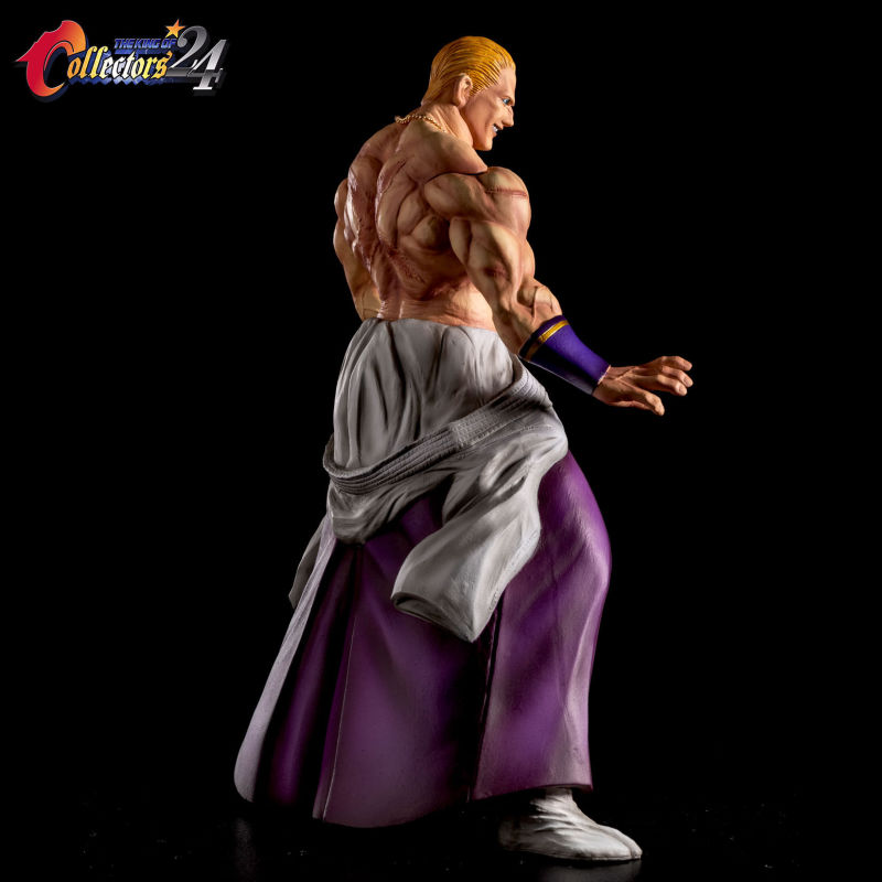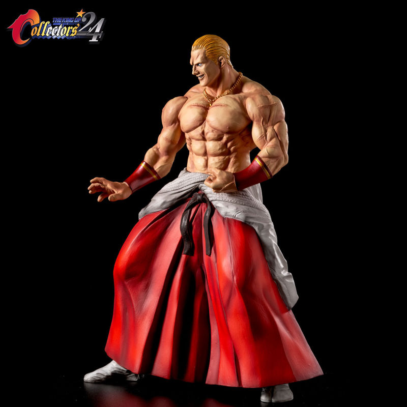THE KING OF COLLECTORS’ 24 No.2 基斯.霍華德,尺寸全高約 19 公分高,由造形師稲坂浩臣擔任原型,結合知名格鬥類繪師森氣樓的插畫與遊戲中的畫面,還原基斯雄勃勃的神情,笑容帶有一絲邪氣;造型也細緻刻劃,包含臉上的細紋與壯碩的上半身肌肉線條,藉由細膩的上色提高立體感,胸背上的疤痕也逼真再現。半脫的和服與袴帶有布紋皺褶,脖子上的項鍊更以黃銅打造,整體霸氣十足!