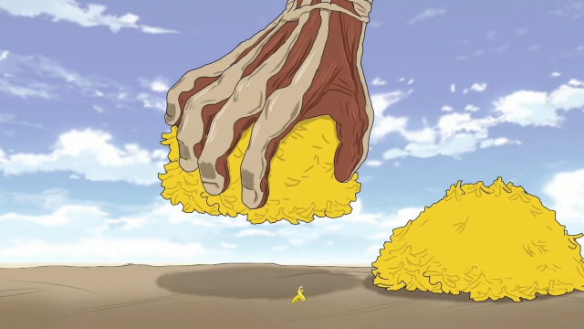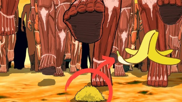 簡單來說…就是讓這些超大型巨人踩到香蕉皮,然後重重地摔了一跤,就能結束這場人間末日了!當然,只是十幾條香蕉皮是不足以讓巨人們跌倒撲街啦,既然是超大型巨人,那所需要的香蕉皮數量必須是乘上好幾倍的數量了~