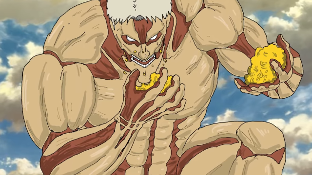 變身成鎧之巨人後,能夠吃下的香蕉量就會變多,意味著多出來的香蕉皮就能夠滿足讓超大型巨人滑倒的條件,當所有巨人全都摔好摔滿時,全世界就會獲得拯救,就能就專心與成為始祖巨人的艾連戰鬥了!