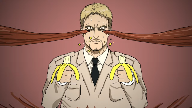 好,那都說到這個份上了,那要由誰來接下這個重責大任呢?當然就是一心想阻止艾連,卻又被頻頻打慘(?)的「鎧之巨人」萊納負責這項「吃光所有香蕉」的任務了!