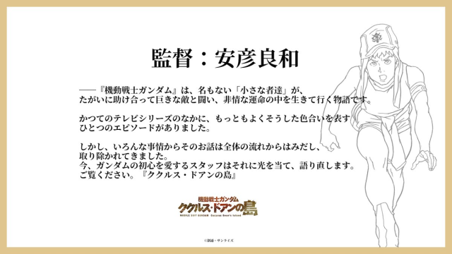 本作導演由安彦良和負責,相信鋼彈粉對他都不陌生,過去的 《機動戰士鋼彈》也由他負責人物設定和作畫監督,導演工作則有《機動戰士鋼彈 THE ORIGIN》 。對於這次劇場版的作品,安彦良和表示其實這是當初電視動畫版中因為種種原因而刪去的故事,透過熱愛鋼彈的製作團隊可以重新讓這個「小人物」協力對抗巨大敵人,並生存在無情命運的故事搬上大銀幕,覺得十分欣慰,也希望大家能夠進戲院一同欣賞這部作品。