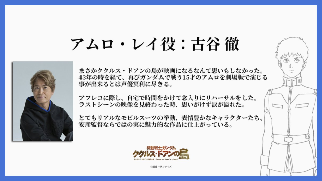 而相繼 43 年,還是演出 15 歲少年阿姆羅的聲優古谷徹則提到,從沒想到庫克羅斯.德安之島的故事會成為電影,過了這麼多年還可以演出 15 歲的阿姆羅,這也是聲優工作的紅利了吧 ( 笑 )。這部是導演安彥獨有吸引力的作品,自己在家看到完結時也默默地流淚,絕對值得鋼彈粉絲前來欣賞。