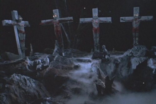 這幕出自於《超人力霸王衛司》第 13 話-死刑!ウルトラ5兄弟(死刑!超人五兄弟)的場景,以力霸王被異次元人亞波人(Yapool) 的計策綁在十字架上的樣貌還原。