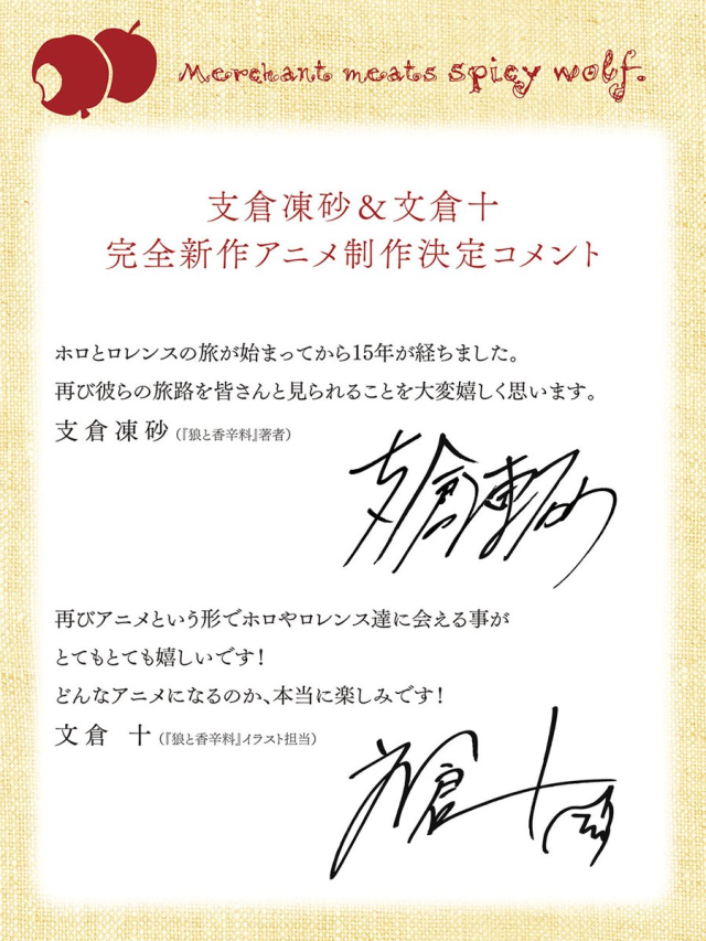 過去《狼與辛香料》曾在 2008 與 2009 推出過兩季的電視動畫,當時播出深受好評,沒想到這次在作品 15 周年之際宣布將推出完全新作動畫,也讓不少粉絲十分興奮。原作支倉凍砂與繪師文倉十也都非常開心能在 15 周年得知這個消息,希望各位粉絲能和赫蘿&羅倫斯再次踏上旅程。