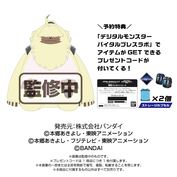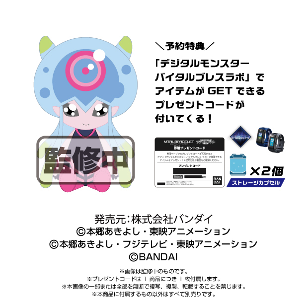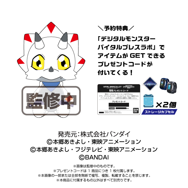 除此之外,萬代官方還特別宣布,消費者凡是在預購期間內訂購《數碼寶貝幽靈遊戲》Chibiぬいぐるみ布偶娃娃,便特別附贈一張「數碼寶貝 育成手環」道具兌換碼一張,玩家只要輸入指定代碼,就可獲得「數碼寶貝 育成手環」APP的冷藏櫃兩個,不過兌換碼只限於日本地區使用。