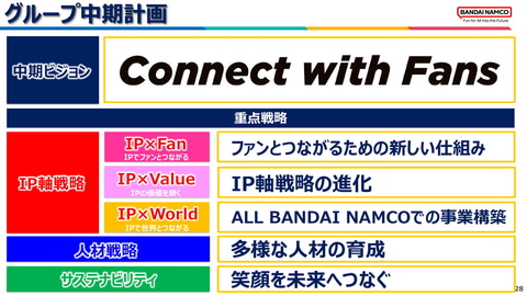 為了因應接下來 3 年的集團的中期計畫「IP元宇宙」做準備,準備投入 150 億日圓實踐元宇宙目標「Connect with Fans」 &「 Fun for All into the Future 」,可以看到萬代的企圖心絕對不容小覷;另外也將投資數百億製作新 IP,以及跨集團 IP 計畫的策略,讓未來萬代南夢宮事業體可以更加全面,利用萬代南夢宮的優勢將實體產品和場所與數位元素結合在一起。