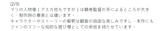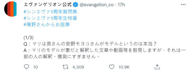 A : 我也有看過這類說法的網路文章或影片,這是部分人的解釋與臆測。事實上包含真希波與明日香等人的人物設定,大抵為鶴卷和哉監督來完成。基本上這個論點是錯誤的,而這些粉絲間的解釋我們也樂觀保留空間給大家臆測,但是對於一些工作團隊的家人保有貶意的臆測較讓人難過。