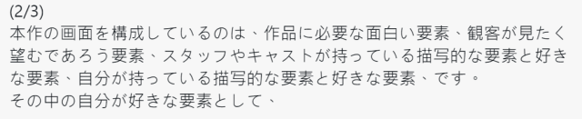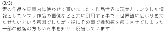 A : 的確有一個比較困惑的事情。因為在本作的畫面構成上,必須要有讓觀眾覺得有趣或期待的要素,而工作團隊與配音人員也有自己喜歡的要素在,更別說我自己也是。而其中我自己最喜歡的要素,我採用了妻子的作品中的畫面構成,也包含了參考吉卜力工作室的作品來拓展作品的世界觀。相對的,這可能會讓有些觀眾感到不舒服,我也對此反省。