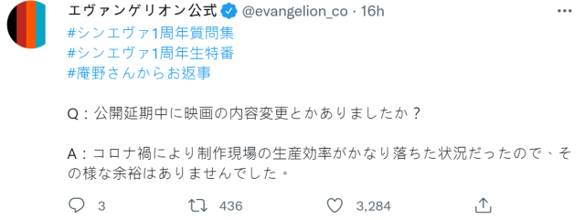 Q : 《福音戰士新劇場版:終》在延後上映期間中,是否有作內容的修改 ?