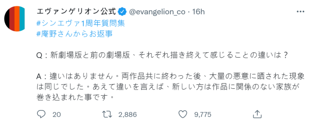 A : 並沒有不同。兩個作品相同的地方,是在完結後都收到大量惡意的訊息。真的要說不同的地方,就是新劇場版沒有涉及家庭的事件。