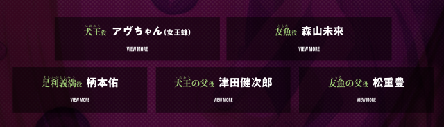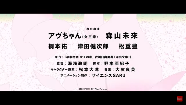 而聲優部分,除了先前公開的森山未來 ( 配音友魚 ) 搭配「日本最神秘樂團」 女王蜂的主唱 AVU chan(アヴちゃん,配音犬王)外,還有包含;柄本佑、津田健次郎、松重豊、片山九郎右衛門、谷本健吾、坂口貴信、川口晃平(能楽師)、石田剛太、中川晴樹、本多 力、酒井善史、土佐和成等人出演,聲優陣容也是非常強力。