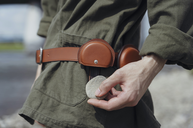 製作上採用皮帶為主體,搭配皮袋上的裝載石頭的皮製袋子,有如軍事舞裝的手榴彈的配件為靈感,打造出功能與質感兼具的趣味配件。而製作人也表示這是為了回味過去童年的「打水漂」記憶,相信不少跟自己一樣有這樣的回憶,現在自己有能力打造這個「打水漂」專用的皮製配件,玩起來更有趣。