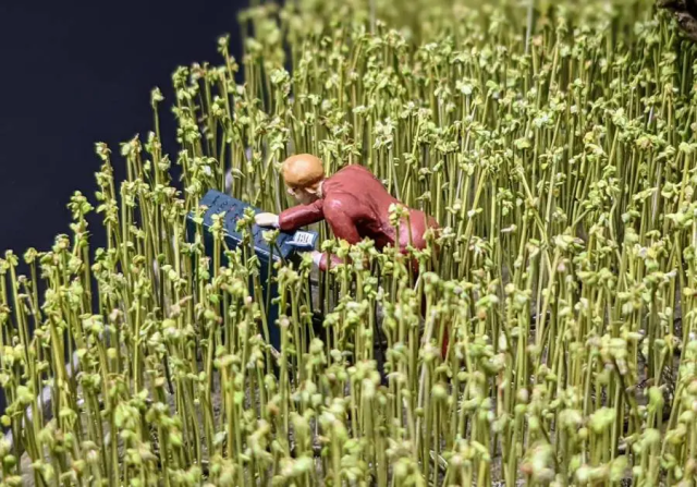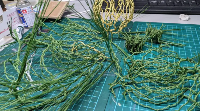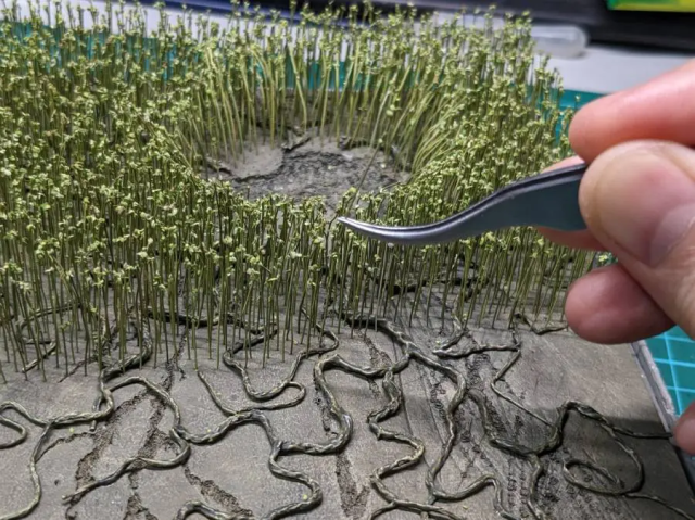 這次最讓推主挑戰的,就是這些草堆的場景布置,他使用銅線加上草的素材一個一個製作插入打造,總計使用了近數千個銅線…十分費工又消耗心力。