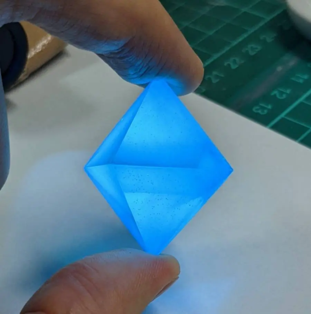 而飛行石本體,推主透過樹脂製作,並塗上螢光的塗料,展現出劇中發光的效果。