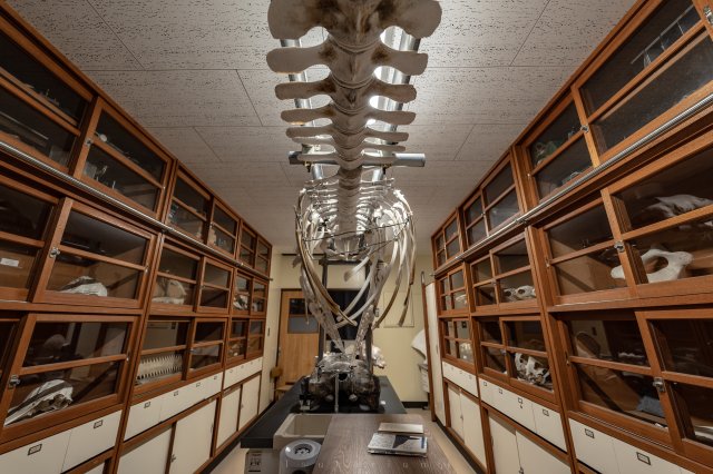 不再使用的學校裡,游泳池變成了鯊魚和海龜的家、跳箱裡有魚、教室裡是大型魚類的骨骼標本……雖然為了魚類的健康,館方並沒有特地去打氣氛燈,但這樣的景象的確是一般時候看不到的,總覺得好像會是哪款遊戲裡面的場景一樣。