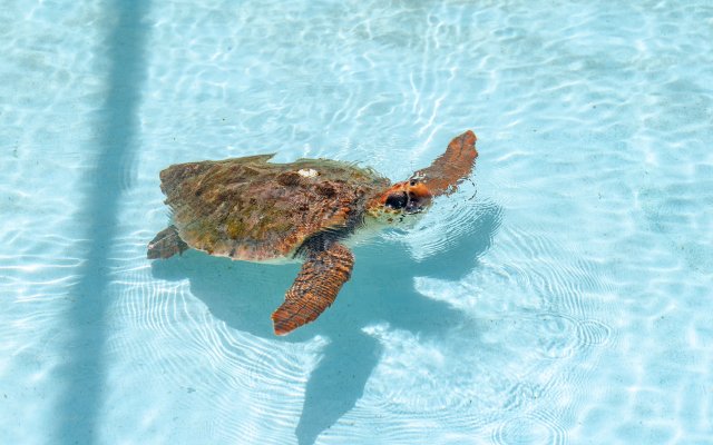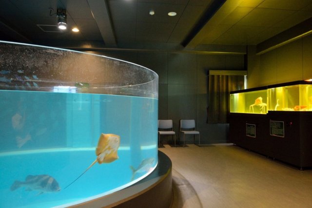 除了直接把室外的25公尺游泳池改裝成大水槽之外,校內也有大大小小共19個海水水槽,裡面展示著各式各樣上千隻的海洋生物,更有不少是當地漁民們抓來(?),或是不小心誤入定置網的赤蠵龜與黑海龜等等。