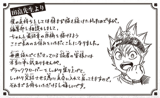 以一個在《週刊少年 Jump》連載七年的人氣作品,在邁入最終章前休刊 3 個月來說,大多數粉絲都能體諒作者與編輯部的顧慮,也希望田畠裕基老師能夠調整好身體狀態在繼續連載,有追《黑色五葉草》相信都很期待最終章的劇情,就讓我們等到七月下旬連載再開吧 !