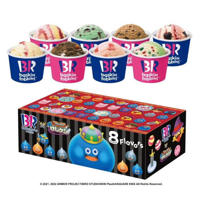 31 冰淇淋最具特色的就是多種的冰淇淋選擇,這次限定包盒裝採用《勇者鬥惡龍》中的各種史萊姆作為包裝設計,購買的朋友只要買 8 個以上就會贈送這個專屬外帶盒。