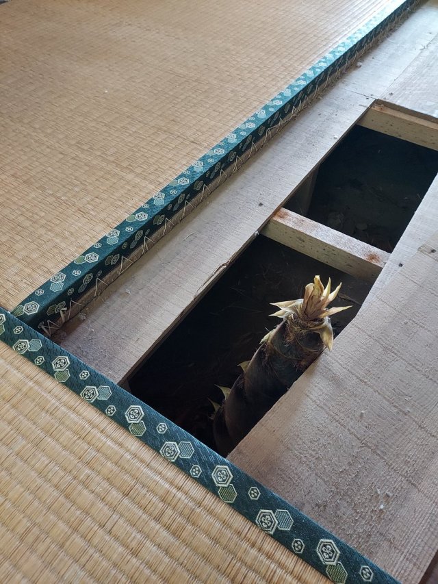 推特網友「おーら自然工房」平時就從事各種自然素材的創作,崇尚大自然的他,相當開心地上傳了一張「地板長出竹筍」的照片。