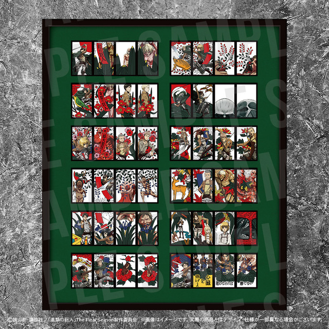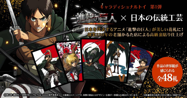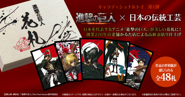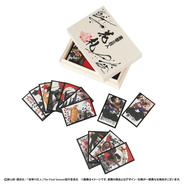 這次結合京都當地開設 220 年的老店舖-大石天狗堂 ,以最原汁原味的傳統工藝打造合作的花牌樣式,可以看到卡牌上也都有著巨人角色結合和風韻味的繪圖,也帶有各種名台詞。