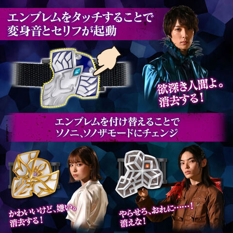 本次手鐲組內含三位主要腦人索諾伊、索諾妮、索諾薩的變身手鐲,按壓手鐲上的紋章即可發出專屬音效以及三人在劇中的台詞,每個手鐲都收錄了近25種劇中台詞,讓你可以一再回味三位腦人在劇中的表現。